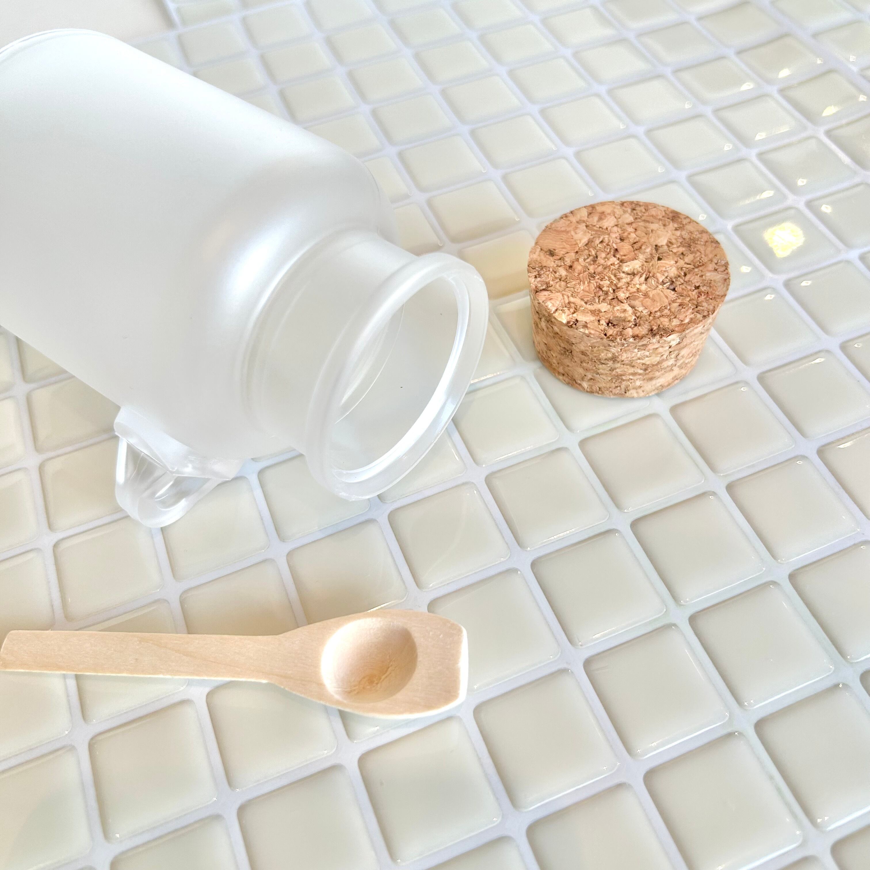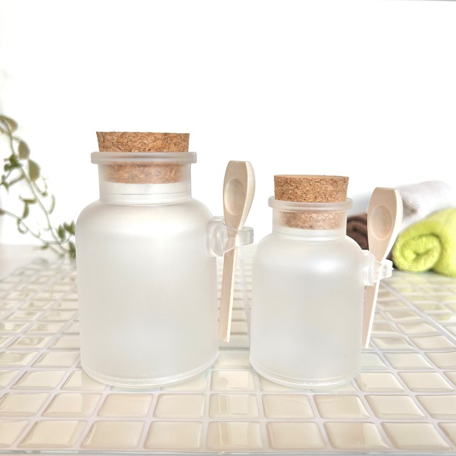 バスソルトを入れたり、ハーブを入れたり、様々な使い方が出来るコルク瓶です。中がうっすらと見える半透明のすりガラス状のプラスチックボトルと木製のスプーンがセットになっています。